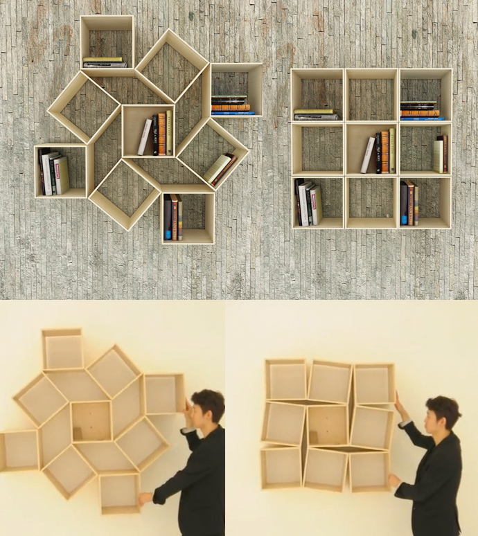 Интересна идея на корейския дизайнер Sehoon Lee, който създава тази динамична етажерка, която променя формата си под влияние на дисбаланса в тежестта на поставение книги и предмети.